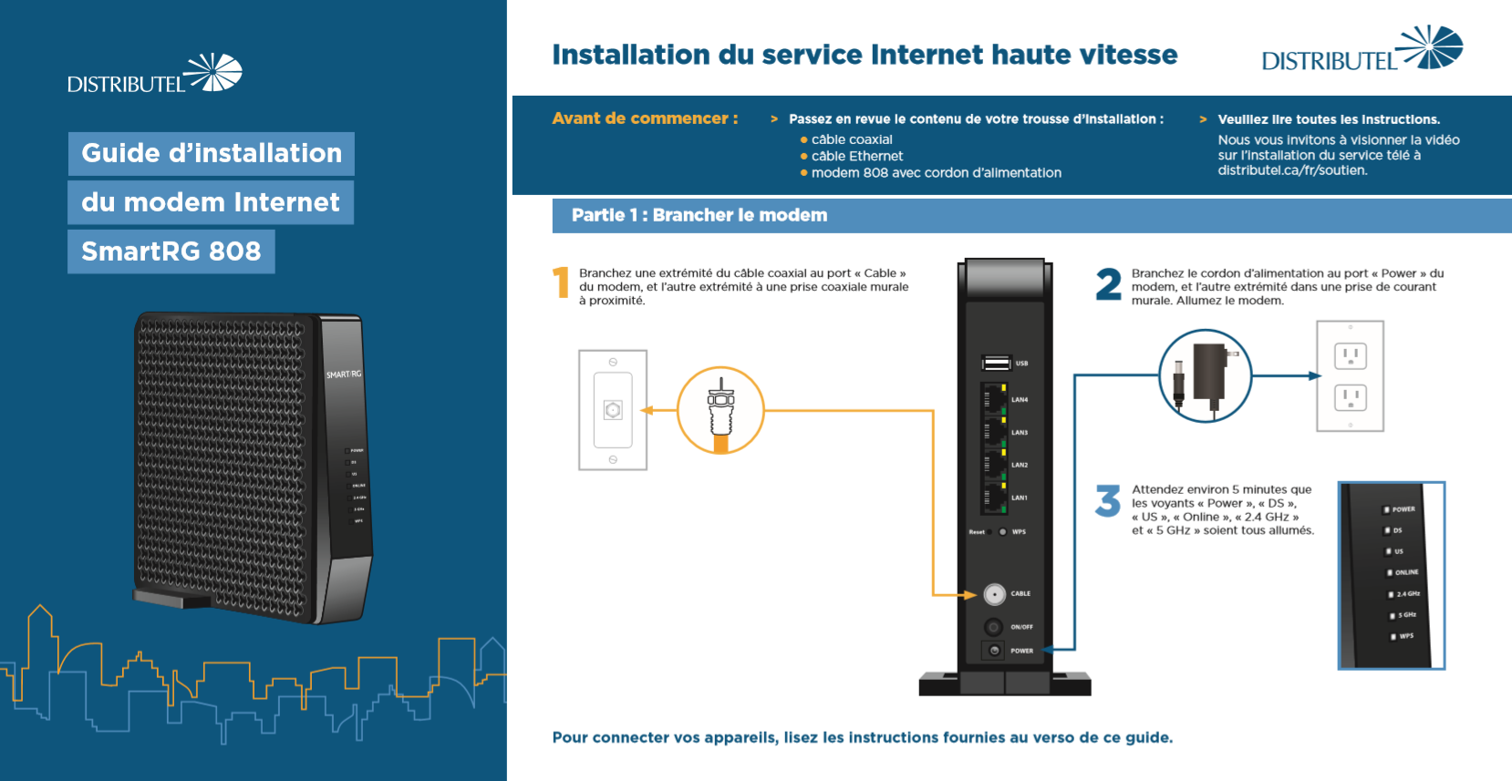 Si-dessous est le Guide d’installation pour le SmartRG 808. Ce guide d'instructions vous permet de vous connecter correctement à votre service Internet câble ainsi que d'établir votre réseau sans fil.