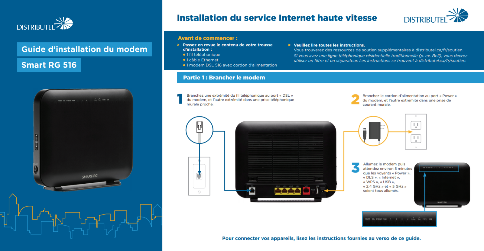 Si-dessous est le Guide d’installation pour le SmartRG 516. Ce guide d'instructions vous permet de vous connecter correctement à votre service Internet DSL ainsi que d'établir votre réseau sans fil.