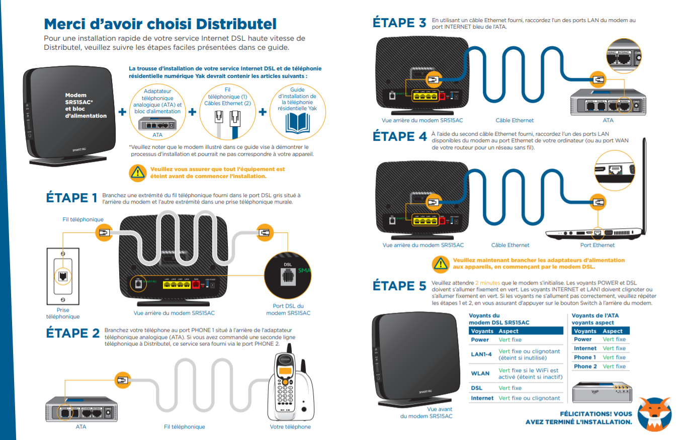Si-dessous est le Guide d’installation pour le SmartRG 515. Ce guide d'instructions vous permet de vous connecter correctement à votre service Internet DSL ainsi que d'établir votre réseau sans fil.