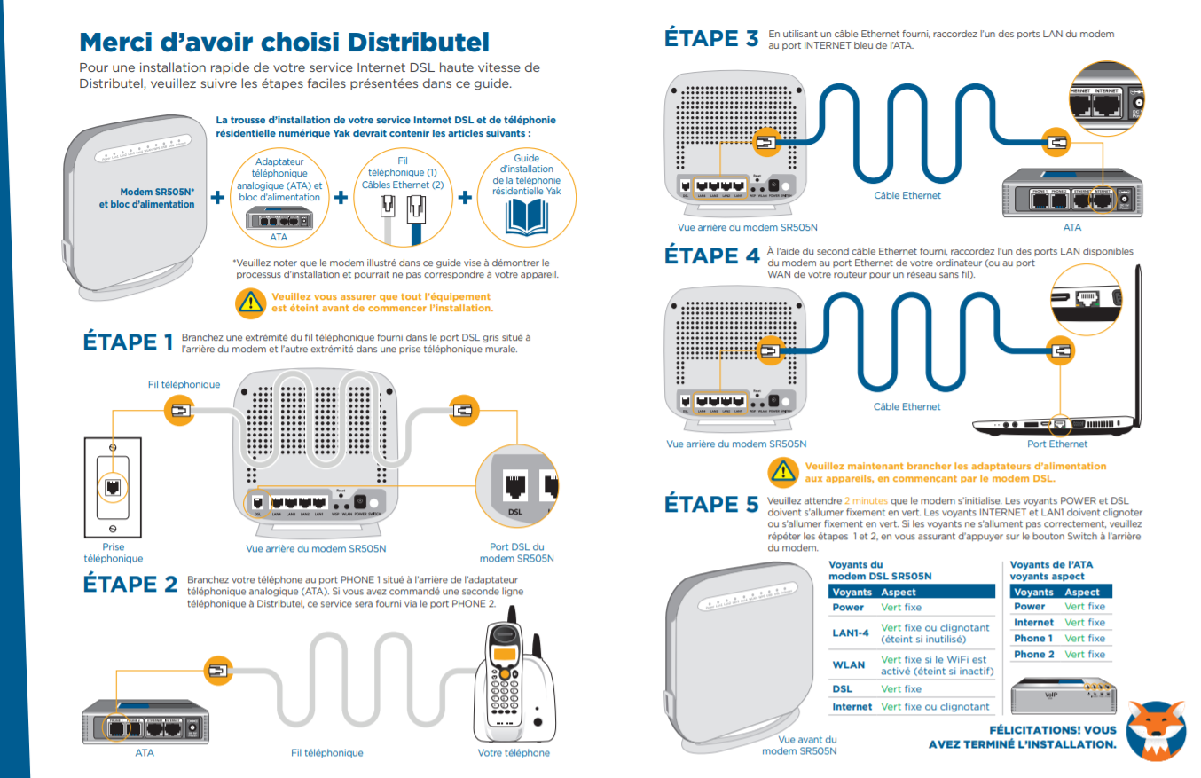 Si-dessous est le Guide d’installation pour le SmartRG 505. Ce guide d'instructions vous permet de vous connecter correctement à votre service Internet DSL ainsi que d'établir votre réseau sans fil.